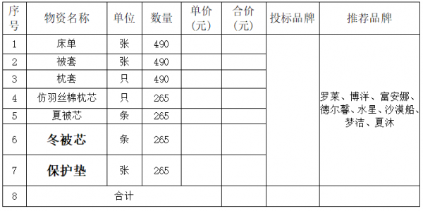 致:各參選人 比選人現(xiàn)將參選人提出的問題及招標文件需要澄清、修改、補遺、答疑的內(nèi)容,統(tǒng)一答復你們,請認真研究。本次澄清、修改、補遺、答疑若與招標文件不一致之處,以本次補充文件為準。一、問:報價明細表中有推薦品牌,其他品牌是否可以參與? 推薦品牌均為家紡產(chǎn)品的品牌,而貴公司所需產(chǎn)品均為酒店布草產(chǎn)品,與家紡產(chǎn)品存在差異,且一般酒店布草的同質(zhì)量產(chǎn)品在技術(shù)標準上均優(yōu)于甲方產(chǎn)品。建議貴公司可以放開參與品牌的范圍,允許類似我司這樣的專業(yè)酒店布草生產(chǎn)廠家參加。答:甲方推薦品牌的,供貨產(chǎn)品品牌須在技術(shù)需求中推薦品牌范圍內(nèi)或相當于(或優(yōu)于)推薦品牌。